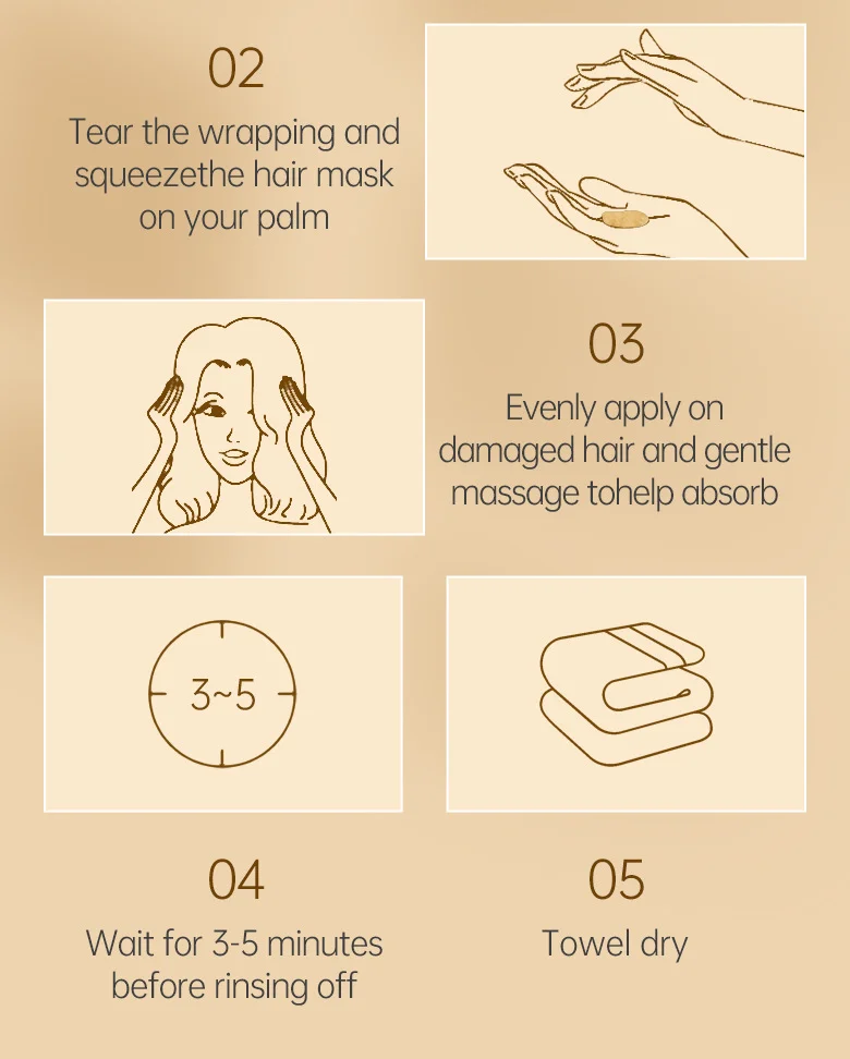 Based on the study of more than hair situation of 10,000 consumers, develop this care products with high technology--- imported raw materials combined with fine molecular technology, 5 seconds to make your hair smooth and soft.